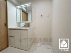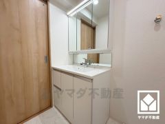 収納付きでスッキリお使い頂ける3面鏡の洗面台です。洗面ボウルが広めなので、忙しい朝でも身支度がしやすく時短になります。