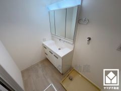 収納付きでスッキリお使い頂ける3面鏡の洗面台です。洗面ボウルが広めなので、忙しい朝でも身支度がしやすく時短になります。