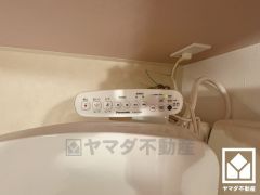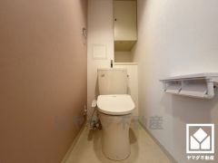 明るく清潔感溢れるトイレです。2連トイレットペーパーホルダーなのでお取替えの手間が軽減できます。トイレットペーパーのストックや、消耗品置き場などとしてお使いいただける吊戸棚がございます。