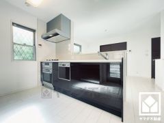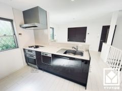 使いやすさとデザイン性を両立。落ち着いたモノトーンテイストが魅力のシステムキッチンです。カウンターキッチンなので配膳や片付けがしやすく、お料理中でもお子様の様子が分かって安心です。