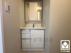 収納付きでスッキリお使い頂ける3面鏡の洗面台です。洗面ボウルが広めなので、忙しい朝でも身支度がしやすく時短になります。