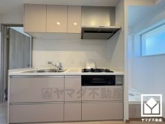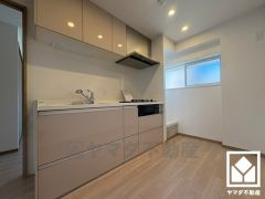 キッチンは空間を有効活用できる壁付けタイプ。右手側に窓がございますので、昼間は手元が明るく、お料理がはかどります。