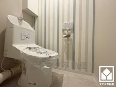 明るく清潔感溢れるトイレです。トイレットペーパーのストックや、消耗品置き場などとしてお使いいただける吊戸棚がございます。