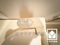明るく清潔感溢れるトイレです。トイレットペーパーのストックや、消耗品置き場、小物置きなどとしてもお使いいただける棚がございます。
