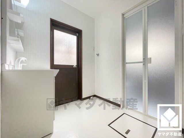 洗面室には勝手口があり、一時的なゴミ置場としても便利です。アウトドア用品のお手入れなど、汚れやすい作業を行った後にそのままお風呂や洗面所へ直行できるので衛生的です。