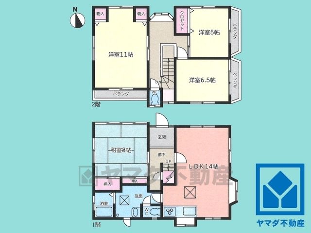 LDK14畳(1F)、和8畳(1F)、洋11畳(2F)、洋6.5畳(2F)、洋5畳(2F) |