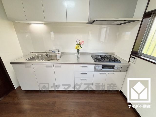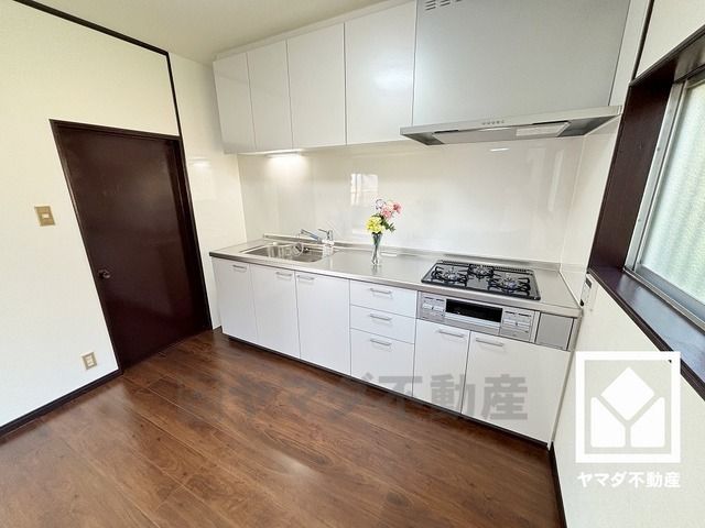 キッチンは空間を有効活用できる壁付けタイプ。キッチン横には窓がございますので、昼間は手元が明るく、お料理がはかどります。