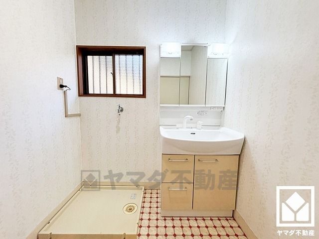 収納付きでスッキリお使い頂ける3面鏡の洗面台です。洗面ボウルが広めなので、忙しい朝でも身支度がしやすく時短になります。