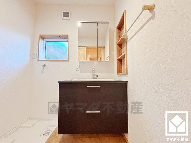 収納付きでスッキリお使い頂ける2階の3面鏡の洗面台です。洗面ボウルが広めなので、忙しい朝でも身支度がしやすく時短になります。