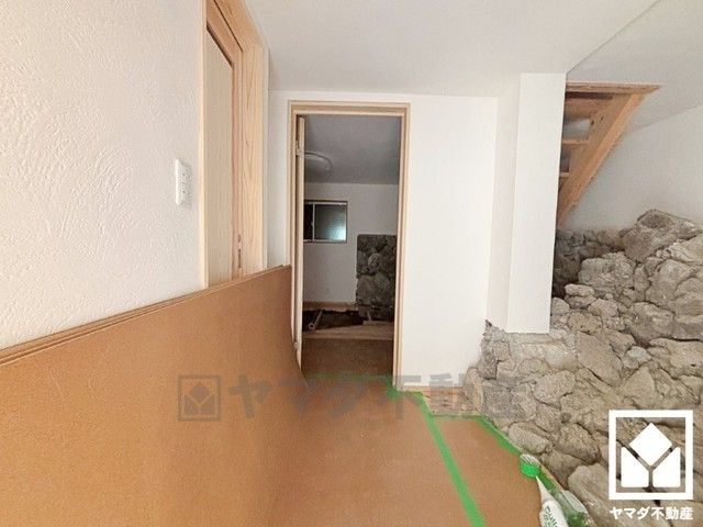 リノベーション中の写真です。重厚感のある石張りの壁が玄関スペースからライブラリーまで続く、インパクトのある空間になります。