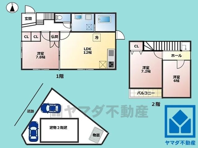 駐車スペースを2台分確保(サイズ要確認)。重い荷物や雨の日の移動もスムーズで、快適なカーライフを実現。来客時にも便利です。