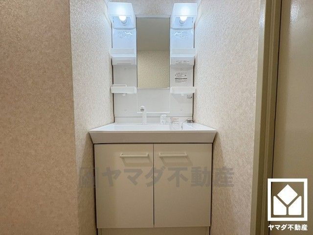 収納付きでスッキリお使い頂ける洗面台です。洗面ボウルが広めなので、忙しい朝でも身支度がしやすく時短になります。
