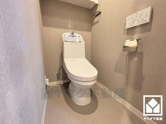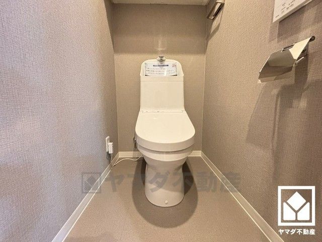 明るく清潔感溢れるトイレです。タオル掛けやペーパーホルダーが設置されています。