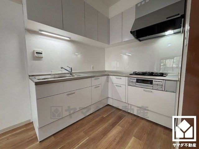 キッチンは空間を有効活用できる壁付けタイプ。L型なので作業動線が最短距離で効率良く動けます。コーナー部分の作業スペースをより広く確保できているのも魅力です。