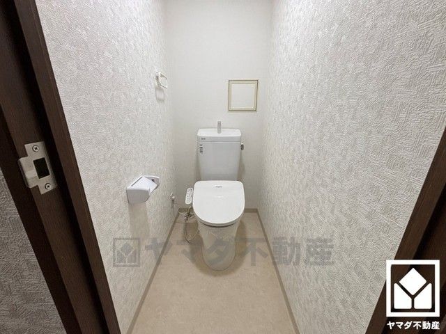 明るく清潔感溢れるトイレです。タオル掛けやペーパーホルダーが設置されています。