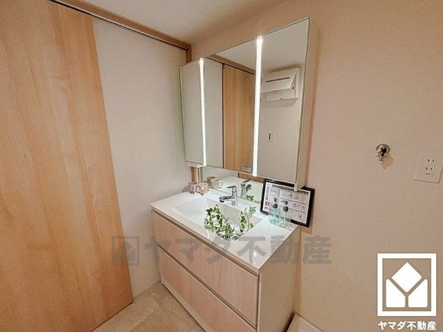 収納付きでスッキリお使い頂ける3面鏡の洗面台です。縦に2本配置されたLED照明が顔全体を明るく均等に照らしてくれるので、スキンケアやメイクがしやすくなります。