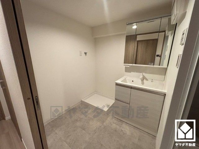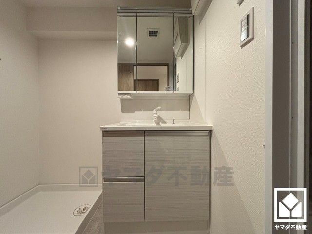 収納付きでスッキリお使い頂ける3面鏡の洗面台です。洗面ボウルが広めなので、忙しい朝でも身支度がしやすく時短になります。
