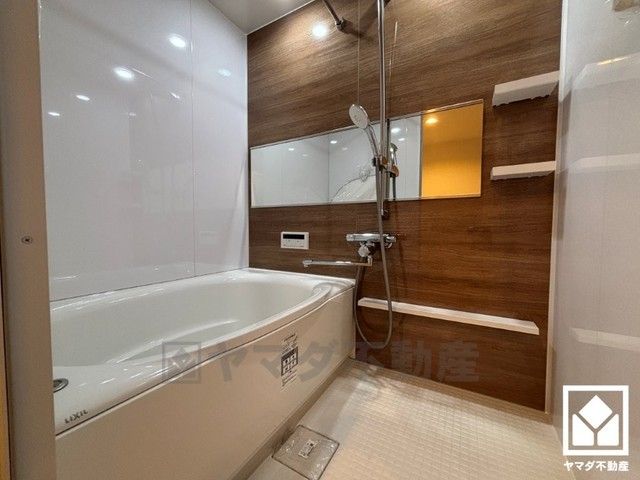 1日の疲れを癒す浴室でゆったりリフレッシュ。ナチュラルな木目調のアクセントパネルは落ち着いた雰囲気を演出してくれます。鏡が横長なので、お子様でも見やすく便利です。