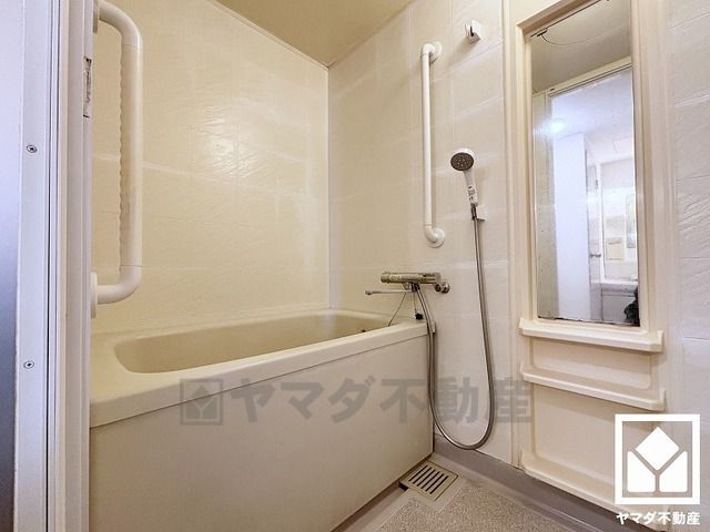 1日の疲れを癒す浴室でゆったりリフレッシュ。清潔感あふれる空間で、毎日のバスタイムをより快適に。手すりが設置されており、入浴の際の転倒防止にも繋がります。