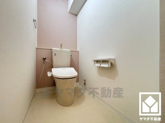明るく清潔感溢れるトイレです。2連トイレットペーパーホルダーなのでお取替えの手間が軽減できます。