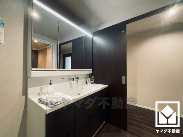収納付きでスッキリお使い頂ける3面鏡の洗面台です。洗面ボウルが広めなので、忙しい朝でも身支度がしやすく時短になります。