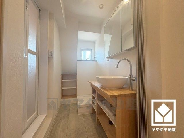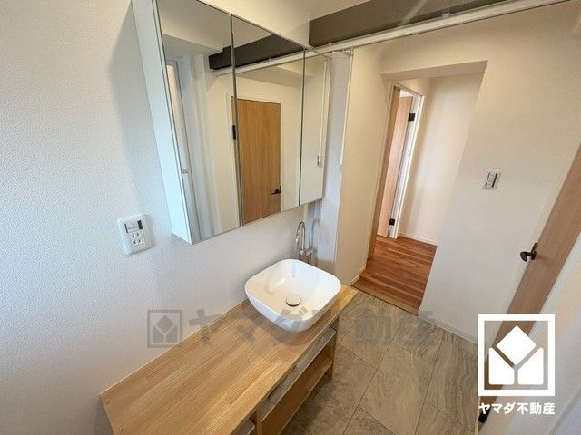 収納付きでスッキリお使い頂ける3面鏡の洗面台です。カウンターが広めなので、忙しい朝でも身支度がしやすく時短になります。