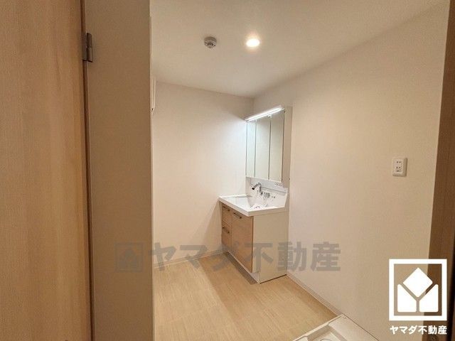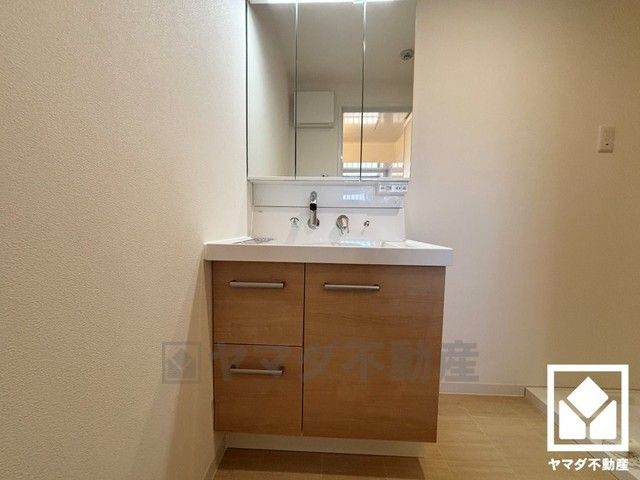 収納付きでスッキリお使い頂ける3面鏡の洗面台です。洗面ボウルが広めなので、忙しい朝でも身支度がしやすく時短になります。