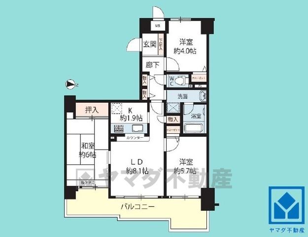 ▲3LDK、専有面積64.11平米、バルコニー面積13.26平米、6階建て3階部分。