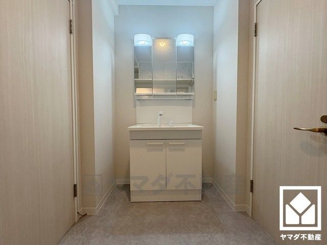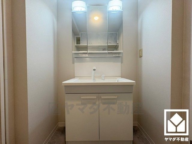 収納付きでスッキリお使い頂ける3面鏡の洗面台です。洗面ボウルが広めなので、忙しい朝でも身支度がしやすく時短になります。