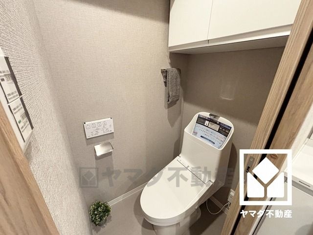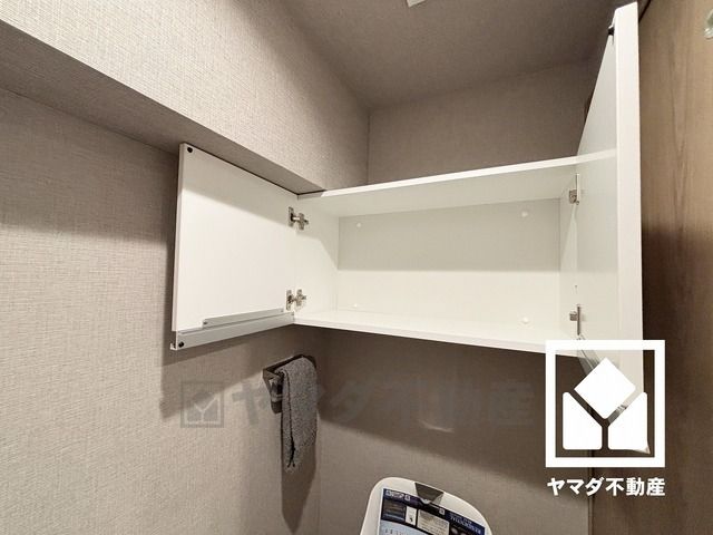 トイレにはトイレットペーパーのストックや、消耗品置き場などとしてお使いいただける吊戸棚がございます。