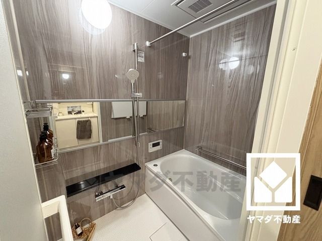 1日の疲れを癒す浴室でゆったりリフレッシュ。ナチュラルな木目調のアクセントパネルは落ち着いた雰囲気を演出してくれます。鏡が横長なので、お子様でも見やすく便利です。