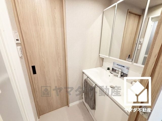 収納付きでスッキリお使い頂ける3面鏡の洗面台です。洗面ボウルが広めなので、忙しい朝でも身支度がしやすく時短になります。