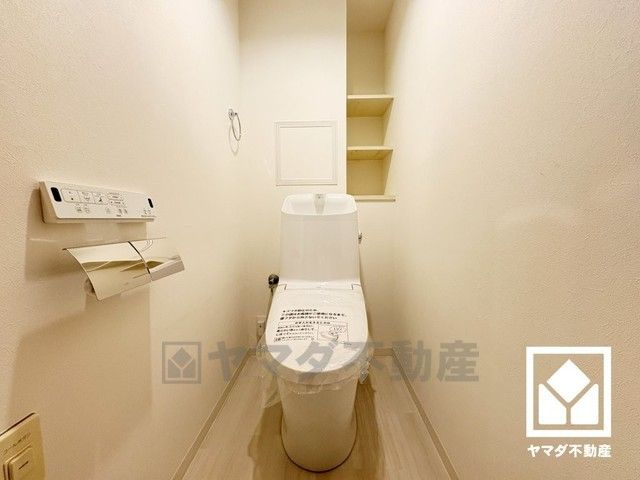 明るく清潔感溢れるトイレです。温水洗浄便座付きで、季節を問わずいつでも温かい便座をお使いいただけます。