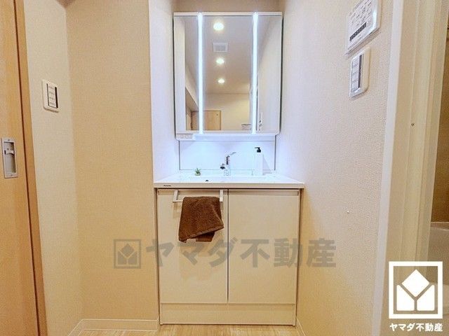 収納付きでスッキリお使い頂ける3面鏡の洗面台です。縦に2本配置されたLED照明が顔全体を明るく均等に照らしてくれるので、スキンケアやメイクがしやすくなります。