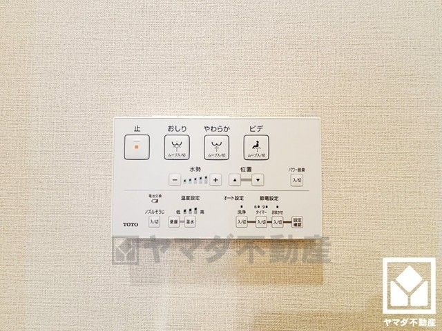明るく清潔感溢れるトイレです。トイレットペーパーのストックや消耗品置き場などとしてお使いいただける吊戸棚がございます。