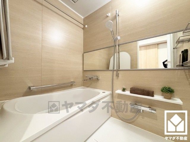 1日の疲れを癒す浴室でゆったりリフレッシュ。ナチュラルな木目調のパネルは落ち着いた雰囲気を演出してくれます。鏡が横長なので、お子様でも見やすく便利です。