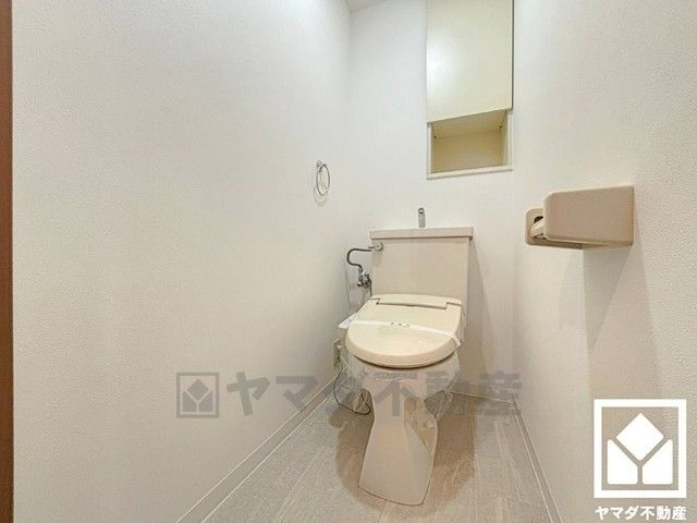 明るく清潔感溢れるトイレです。トイレットペーパーのストックや、消耗品置き場、小物置きなどとしてもお使いいただける棚がございます。