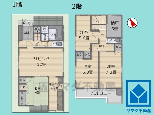 LD12畳(1F)、K4.7畳(1F)、和6畳(1F)、洋7.3畳(2F)、洋6.3畳(2F)、洋5.6畳(2F)、その他3畳(2F) |