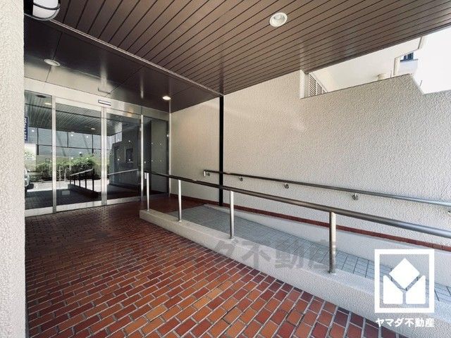 バリアフリーに配慮された、スロープ付きのエントランスアプローチ。