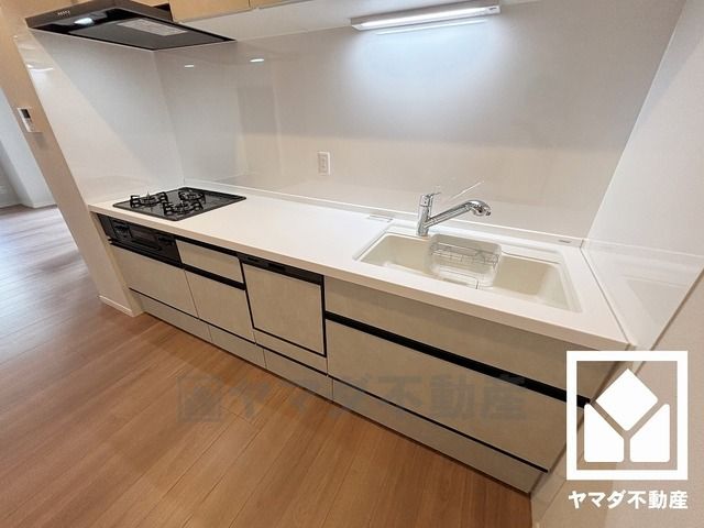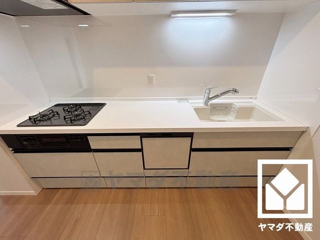 キッチンは空間を有効活用できる壁付けタイプ、3口コンロ仕様。毎日の家事の負担を軽減でき、省エネにもなる食器洗乾燥機付き。