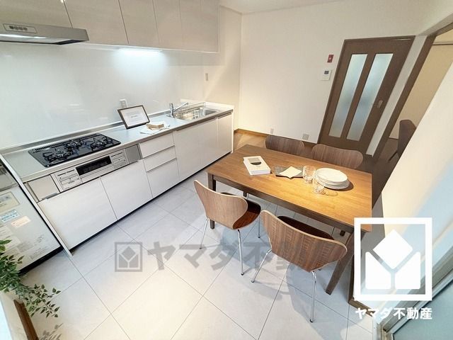 キッチンは空間を有効活用できる壁付けタイプ。フロアタイルとも雰囲気を合わせ、明るい白色で統一された清潔感のあるデザインが魅力のシステムキッチンです。