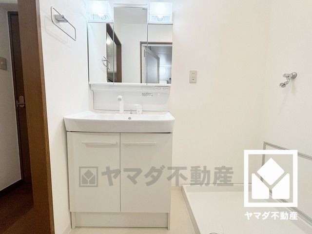 収納付きでスッキリお使い頂ける3面鏡の洗面台です。洗面ボウルが広めなので、忙しい朝でも身支度がしやすく時短になります。