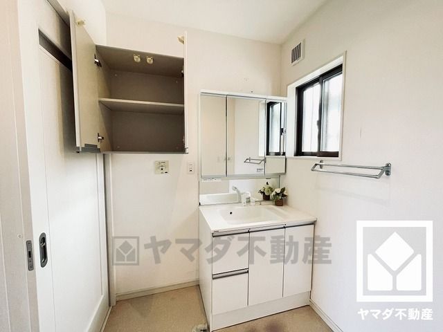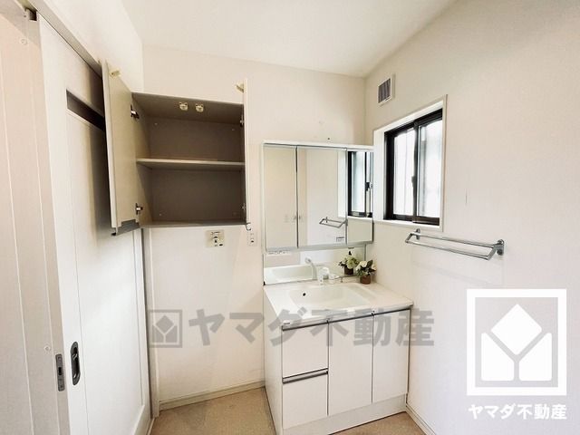 使いやすさが考えられた3面鏡です。吊戸棚が設置されているので洗剤等の消耗品等をすっきり片付けることができます。