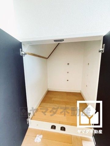 玄関には階段下収納がございます。ご家族の履き物がスッキリ片付きます。