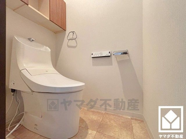 明るく清潔感溢れるトイレです。トイレットペーパーのストックや、消耗品置き場、小物置きなどとしてもお使いいただける吊戸棚がございます。