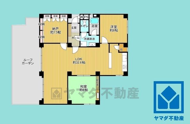 約29.06帖の広々とした南側ルーフガーデン付き。洗濯物もカラッと乾き、ガーデニングやカフェ気分も楽しめる空間。