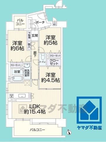 3LDK、専有面積67.76平米、バルコニー面積14.28平米、11階建て4階部分の南向き角部屋。