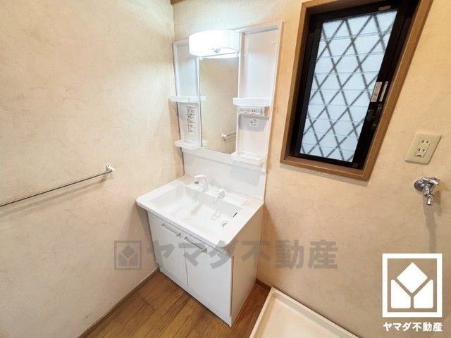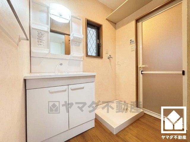 広々カウンターと多機能収納で、スッキリ整理整頓できる洗面台。令和7年2月交換済。