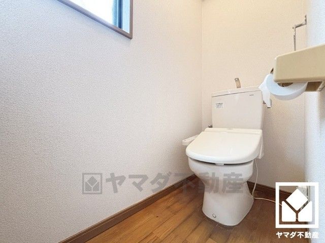 明るく清潔感溢れるトイレです。トイレにも小窓が付いており、明るく換気のしやすい空間です。令和7年2月壁天井クロス貼替済。