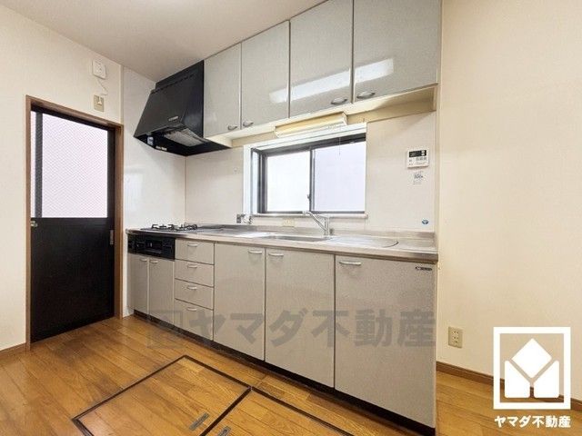 キッチンは空間を有効活用できる壁付けタイプ。キッチン横には勝手口があり、ゴミ出し便利です。令和7年2月ガスコンロ交換済。